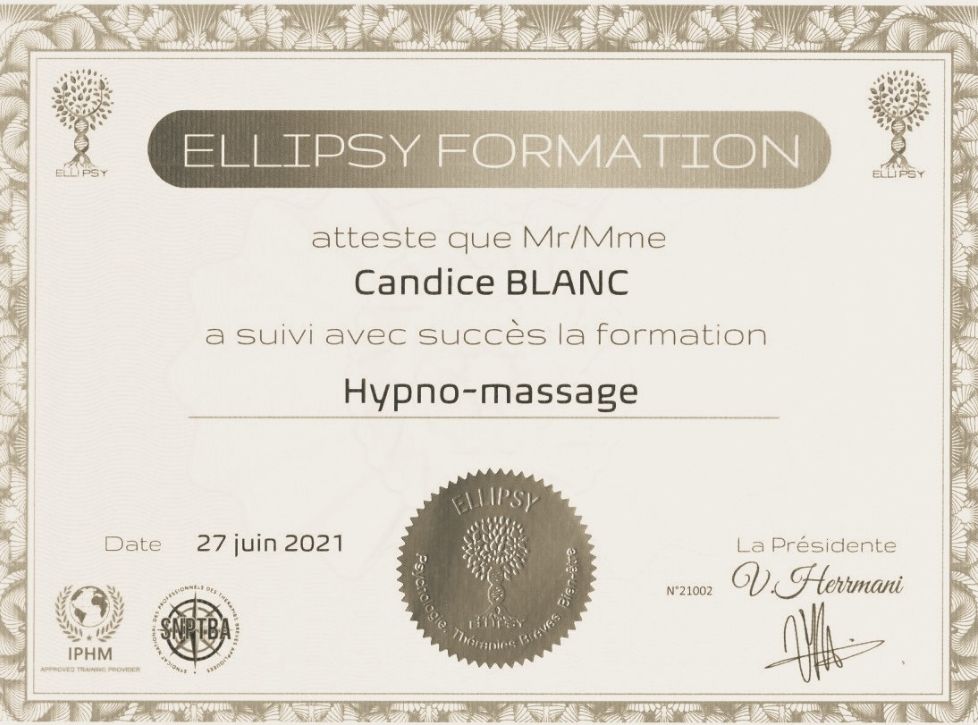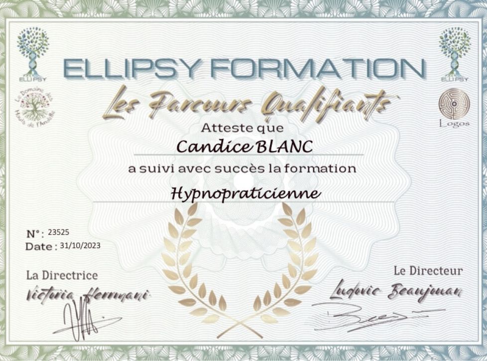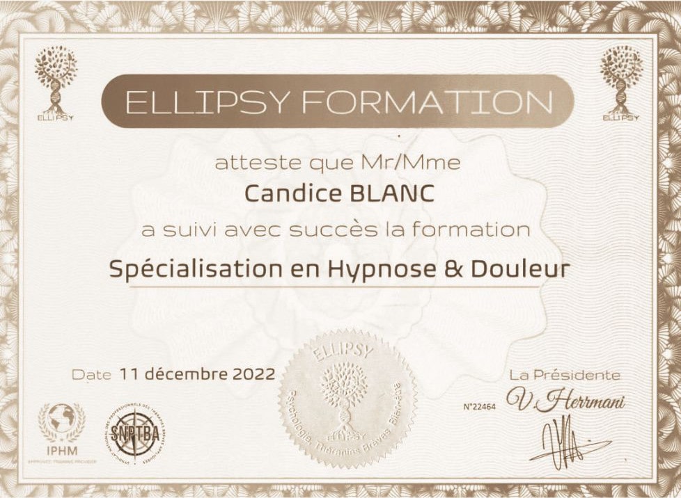 Je suis aujourd’hui certifiée en hypnose, suite à ma formation au sein du centre Ellipsy.