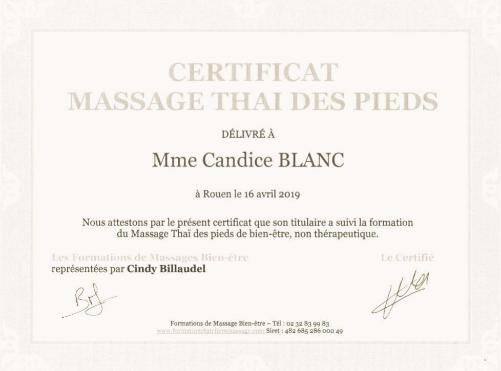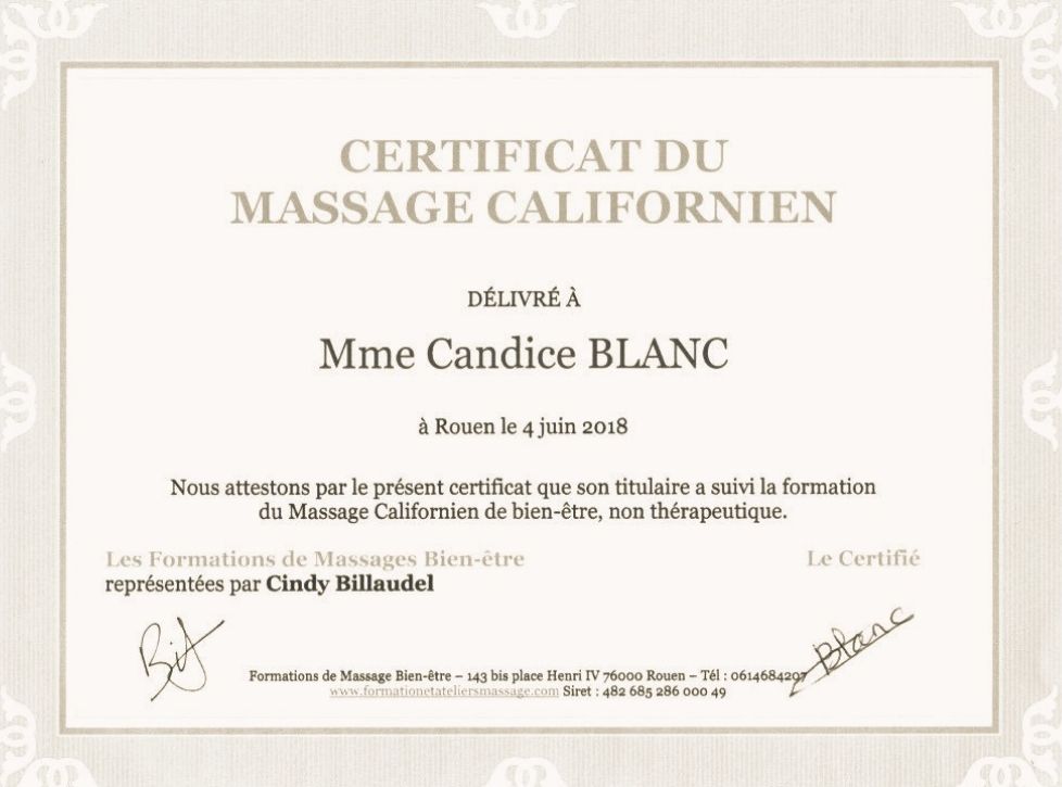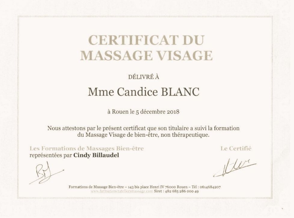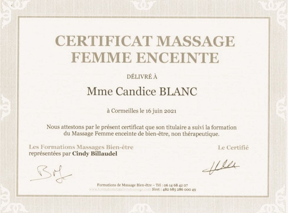 J’ai également été formée à des techniques corporelles favorisant le relâchement et le bien-être avec Cindy Billaudel (massage californien, massage du visage, massage thaï des pieds), qui ont enrichi ma compréhension du lien entre le corps et les émotions.